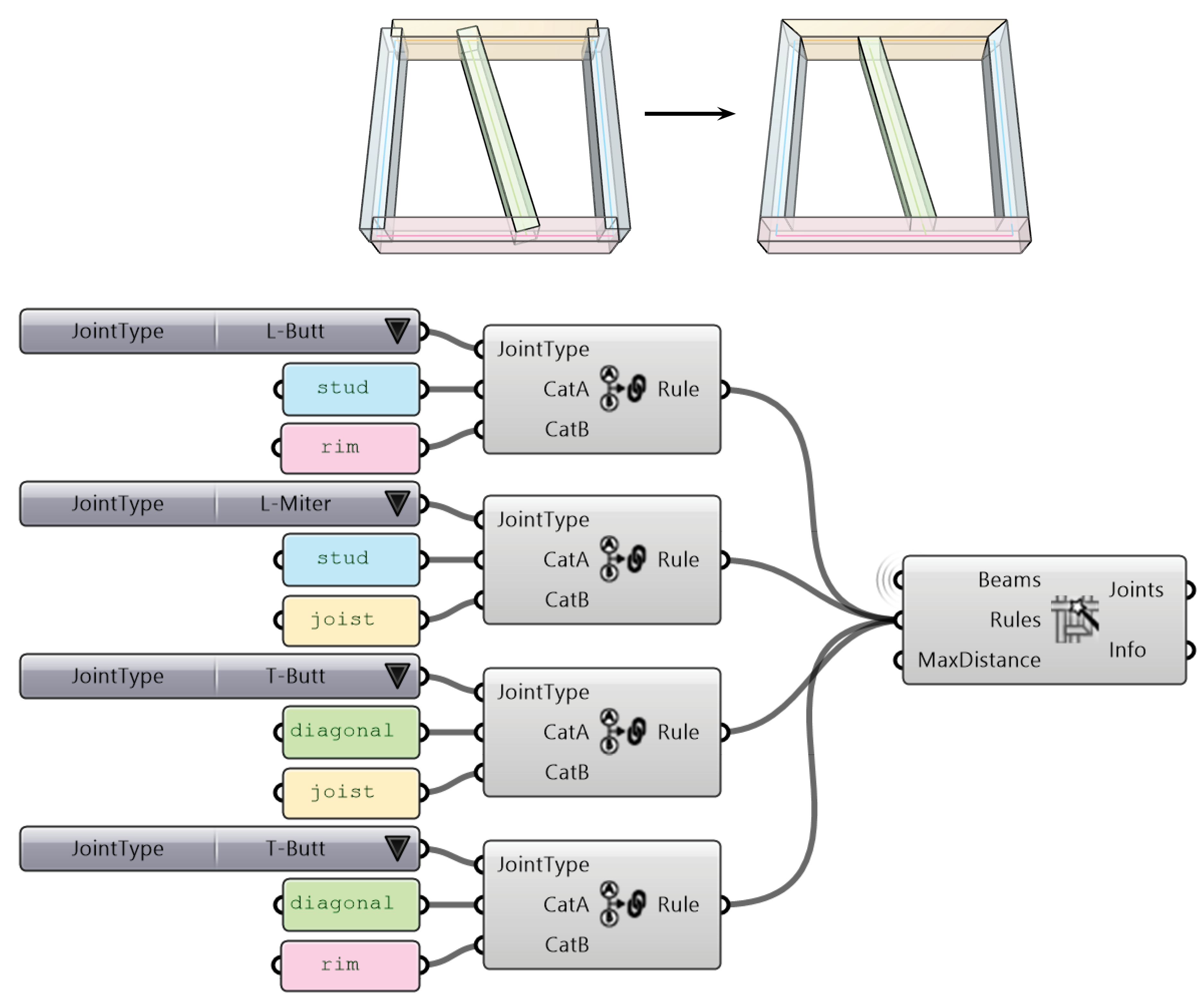 AutomaticJoints component does two things: First, it determines if two beams connect and if yes, determines the joint topology (I, L, T or X). Then, it assigns the join type to every connecting pair of beams according to the defined rules. If the defined joint type has a different topology than the beams, no joint is assigned (Example: two beams form a corner (L) but the rule tries to assign a T-Butt joint).